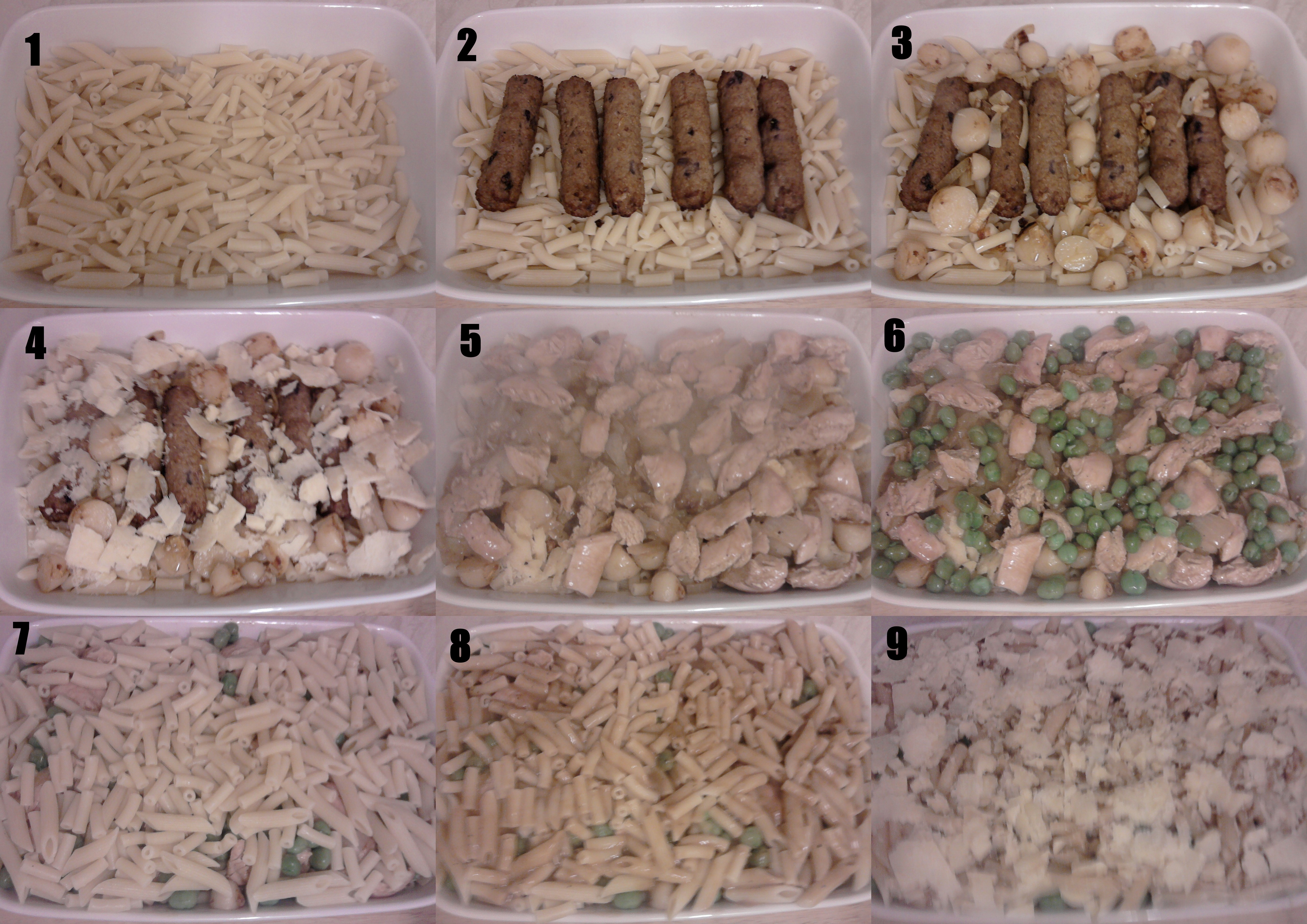 Step 1. Cook some pasta with salt, I mixed penne and macaroni about 4 big handfuls in total, drain it when cooked and spread most (70%) in the dish, leaving some for a top layer. I didn’t butter the dish or anything.